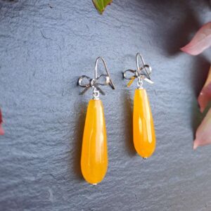 Handmade Teardrop Yellow Agate Earrings with Silver Bow Accent, Statement Earrings, Drop Earrings