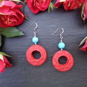 Carved Cinnabar Rose Earrings, Asian Boho Statement Jewellery