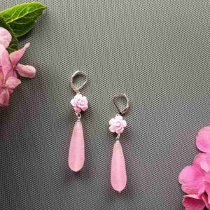 Pink Quartz Drop Earrings, Carved Rose Teardrop Earrings, Statement Earrings, Gift for Her