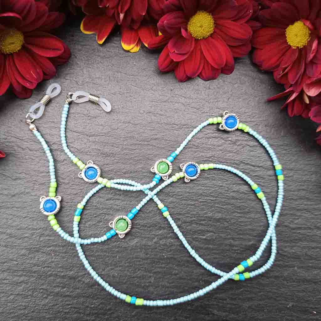Brighten up your everyday eyewear with this charming beaded glasses chain, designed with a playful mix of light blue, green, and yellow seed beads. The strand is accented with silver-tone Cat-themed connectors, each framing a vibrant blue or green cabochon bead that adds a pop of colour and gives the chain a whimsical, boho-inspired look.