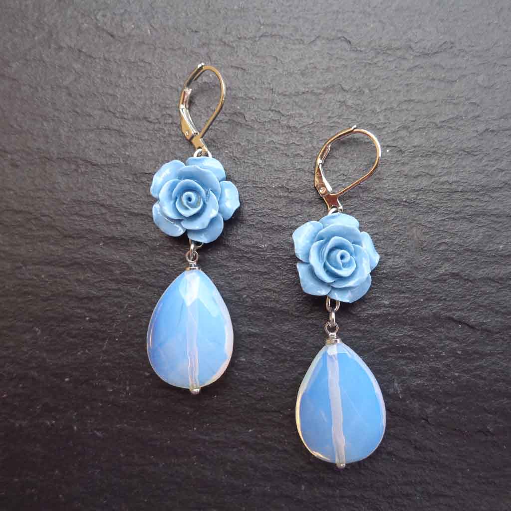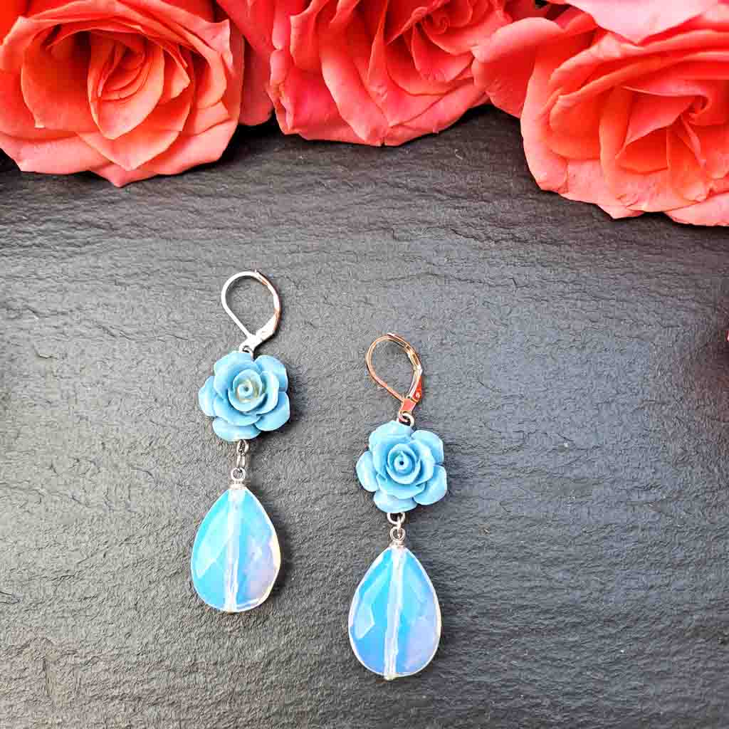 Handmade with care, these Blue Rose Teardrop Earrings combine delicate floral detail with shimmering opal-look drops that catch the light beautifully. The faceted teardrop stones glow with soft blue and white flashes, while the carved blue roses add a romantic, vintage-inspired touch. Lightweight yet eye-catching, they are perfect for adding elegance to everyday outfits or making a statement on special occasions. A thoughtful gift for her, with free gift note and optional gift wrapping included.