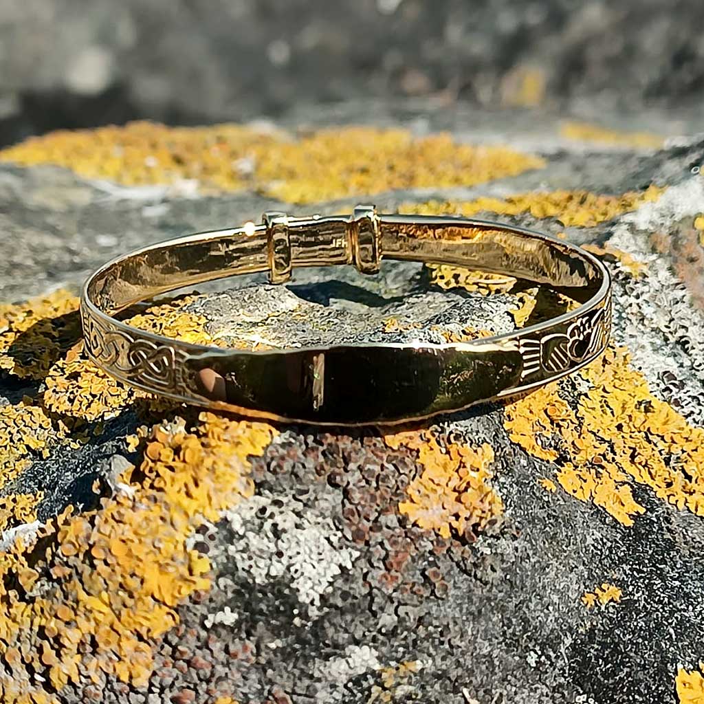 Claddagh Rings have been produced in Galway, Ireland continuously since at least 1700. The Claddagh fishing village, famed for its rings, most likely derived its name from the description of its location in Irish — probably “Cladach,” meaning stony shore. These bangles are Galway-inspired, carrying that same rich cultural heritage and making them a true Irish heirloom gift.