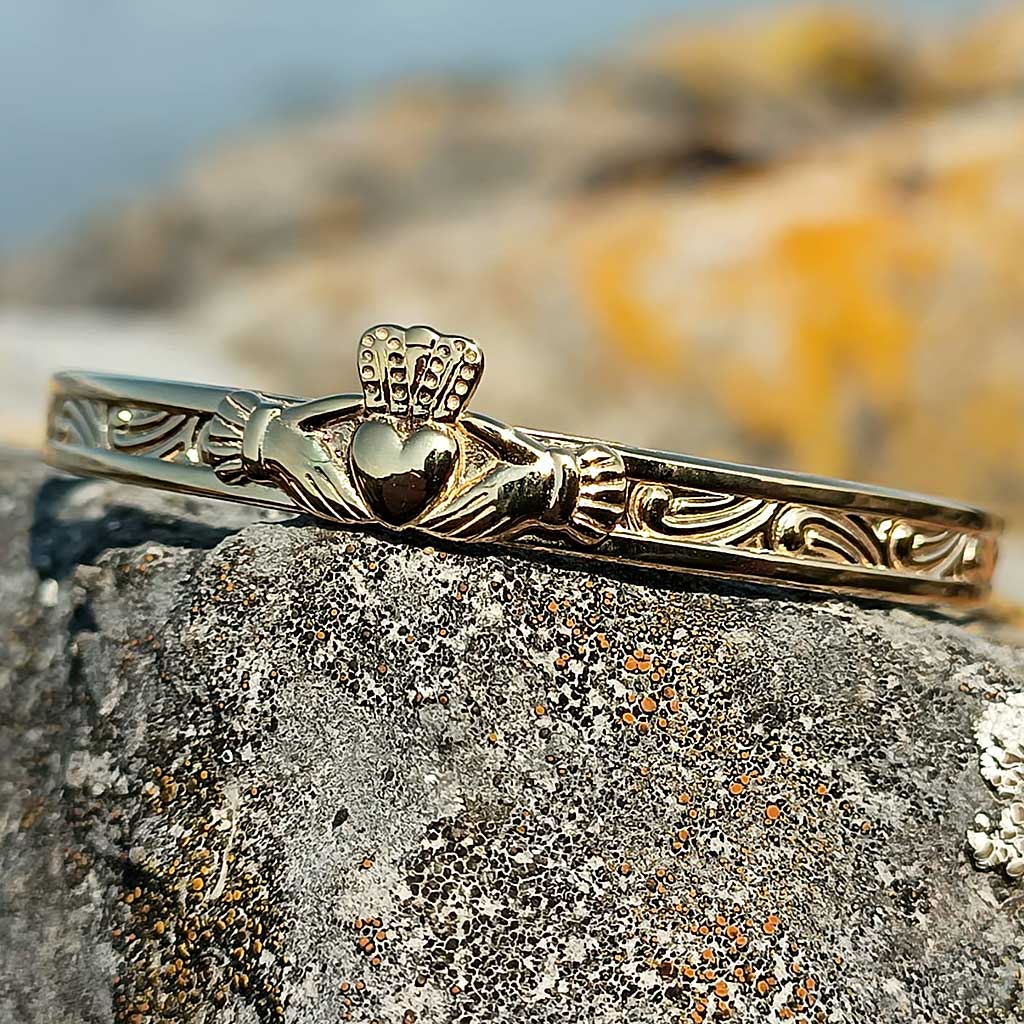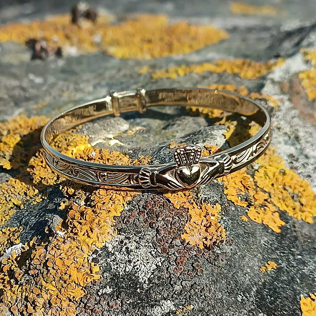 A beautifully crafted gold-plated Claddagh Baby Bangle featuring a central Claddagh Heart, Hands & Crown design. This Galway-inspired Irish symbol of love, loyalty and friendship makes a meaningful keepsake gift for a Christening, new baby, or special occasion. Handcrafted to order by skilled Irish family jewellers and ships from Ireland. Complete your gift with an optional jewellers box and gift wrapping.