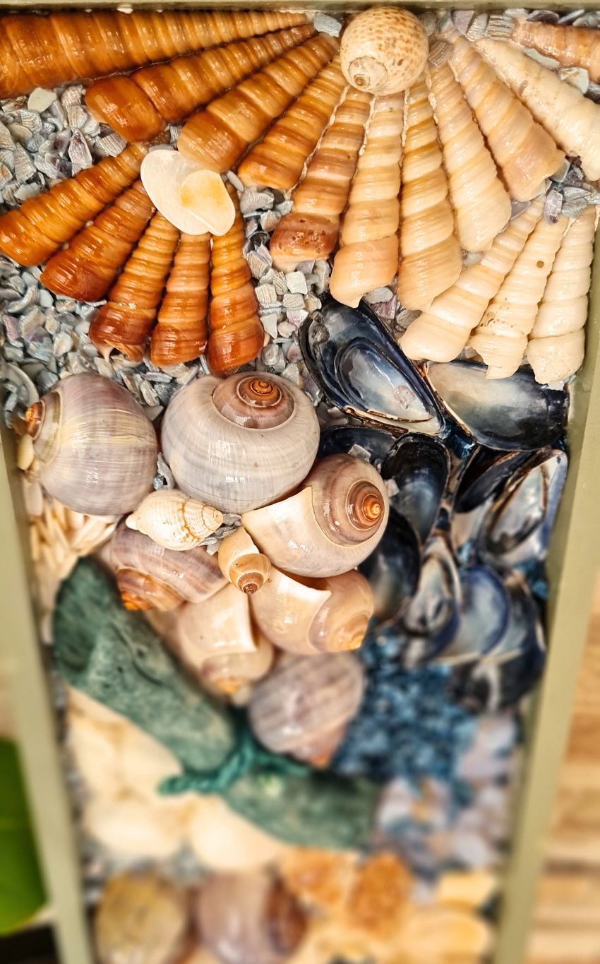 - Medium: Shells, stones, organic materials, archival quality gloss varnish.