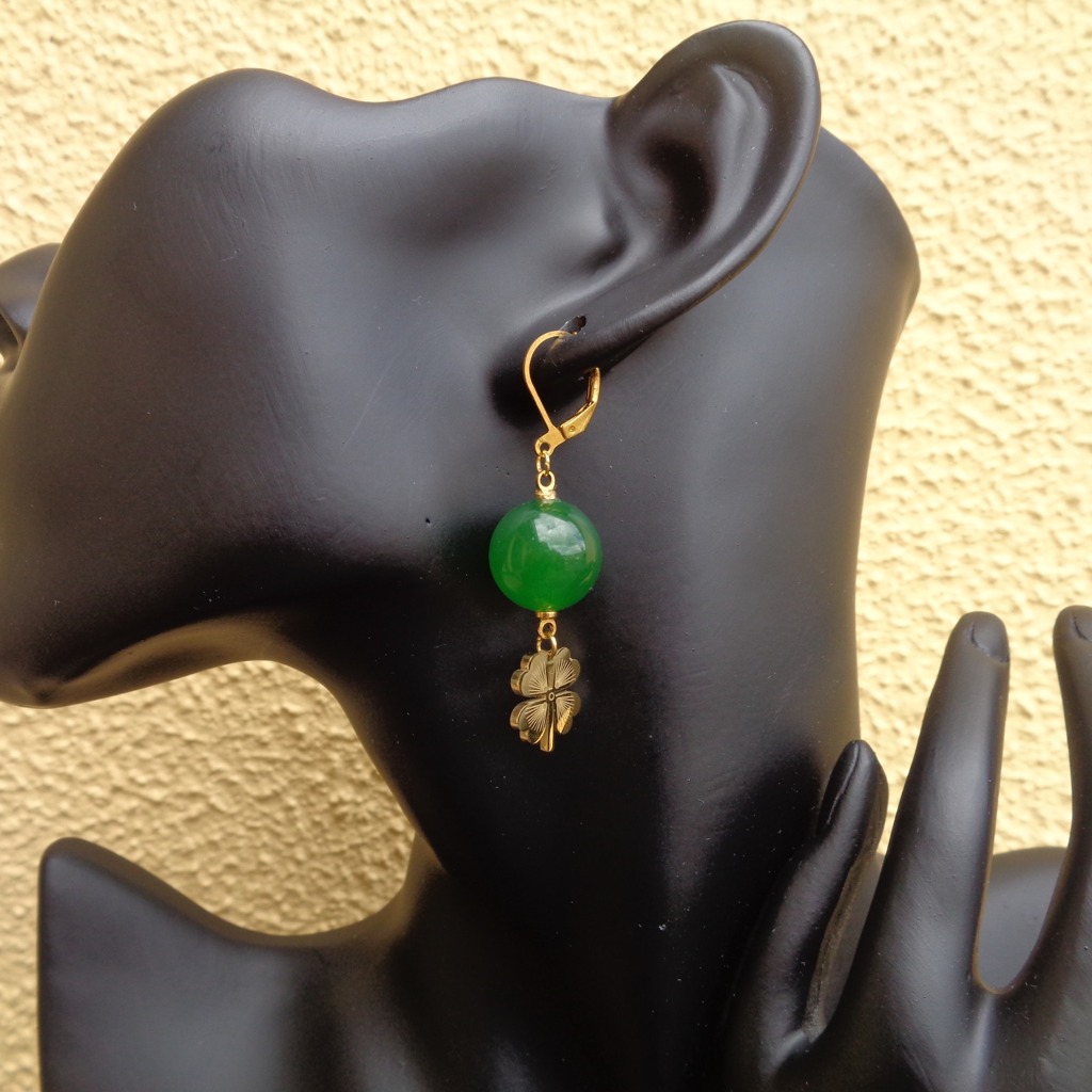 Dangling from each jade gemstone is a stainless steel charm shaped like a four-leaf clover. The clover charms are intricately crafted, with a polished finish that catches the light and adds a touch of whimsy and good fortune to the earrings. The stainless steel ensures durability and a hypoallergenic quality, making them suitable for sensitive skin.