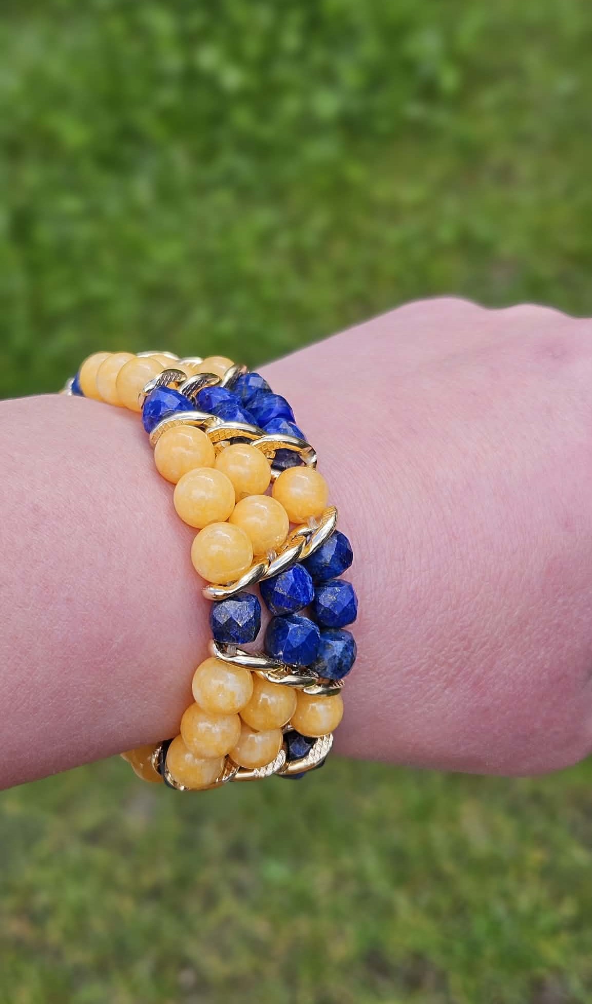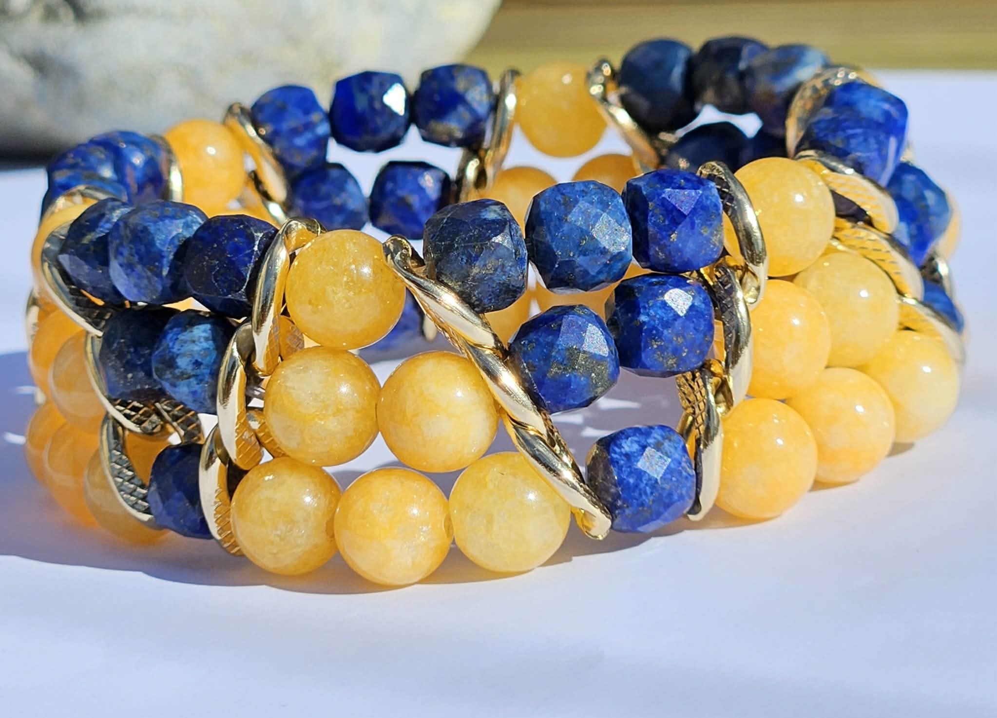 This handcrafted Lapis Lazuli and Golden Quartz triple statement cuff bracelet combines deep royal blue gemstone tones with warm golden quartz shimmer for a striking contrast. The wide cuff design creates a confident, sculptural look that instantly elevates any outfit.