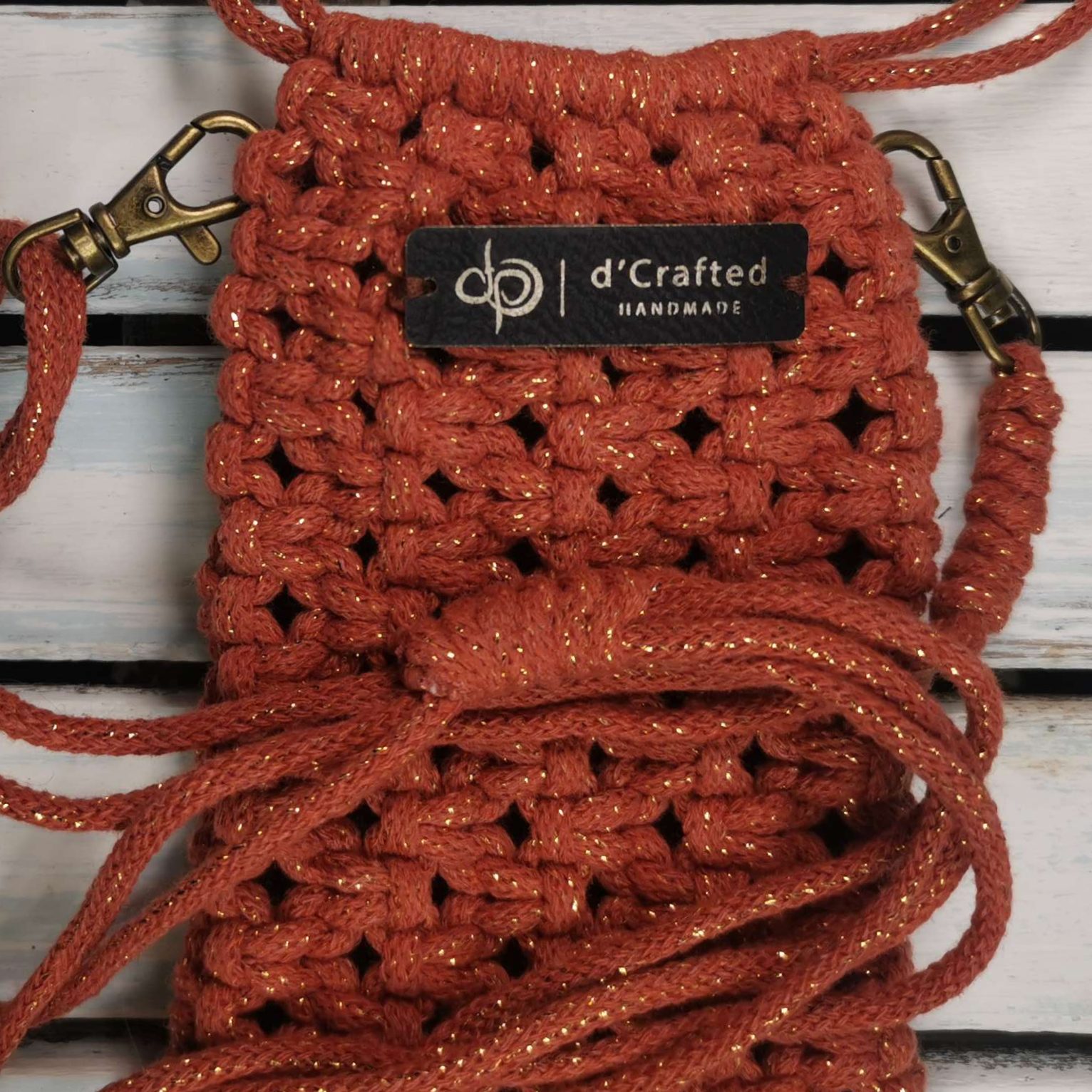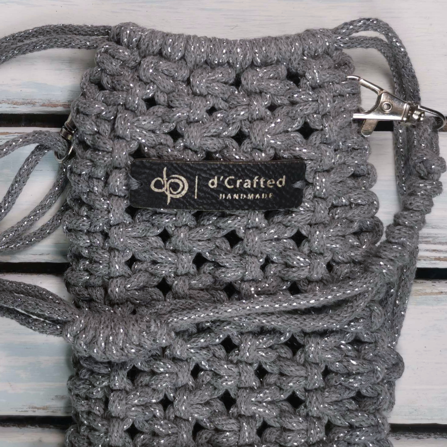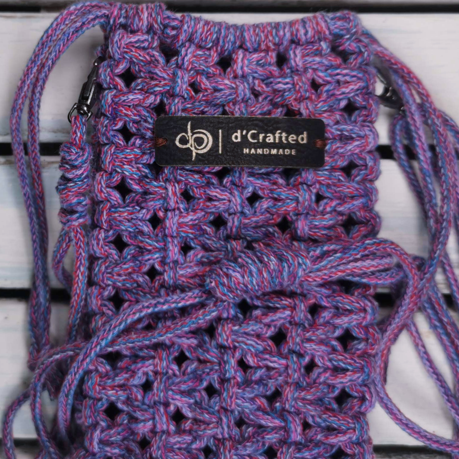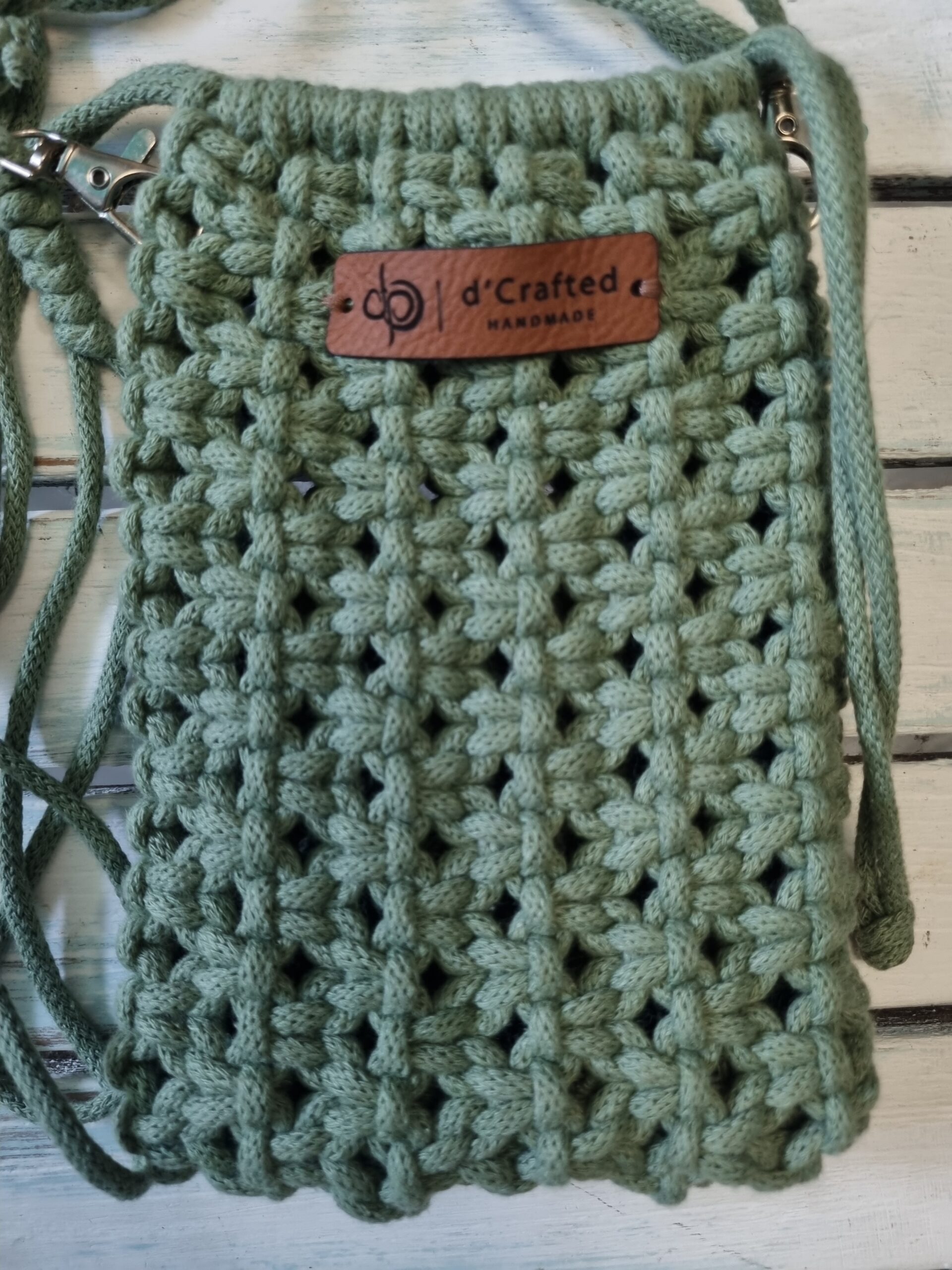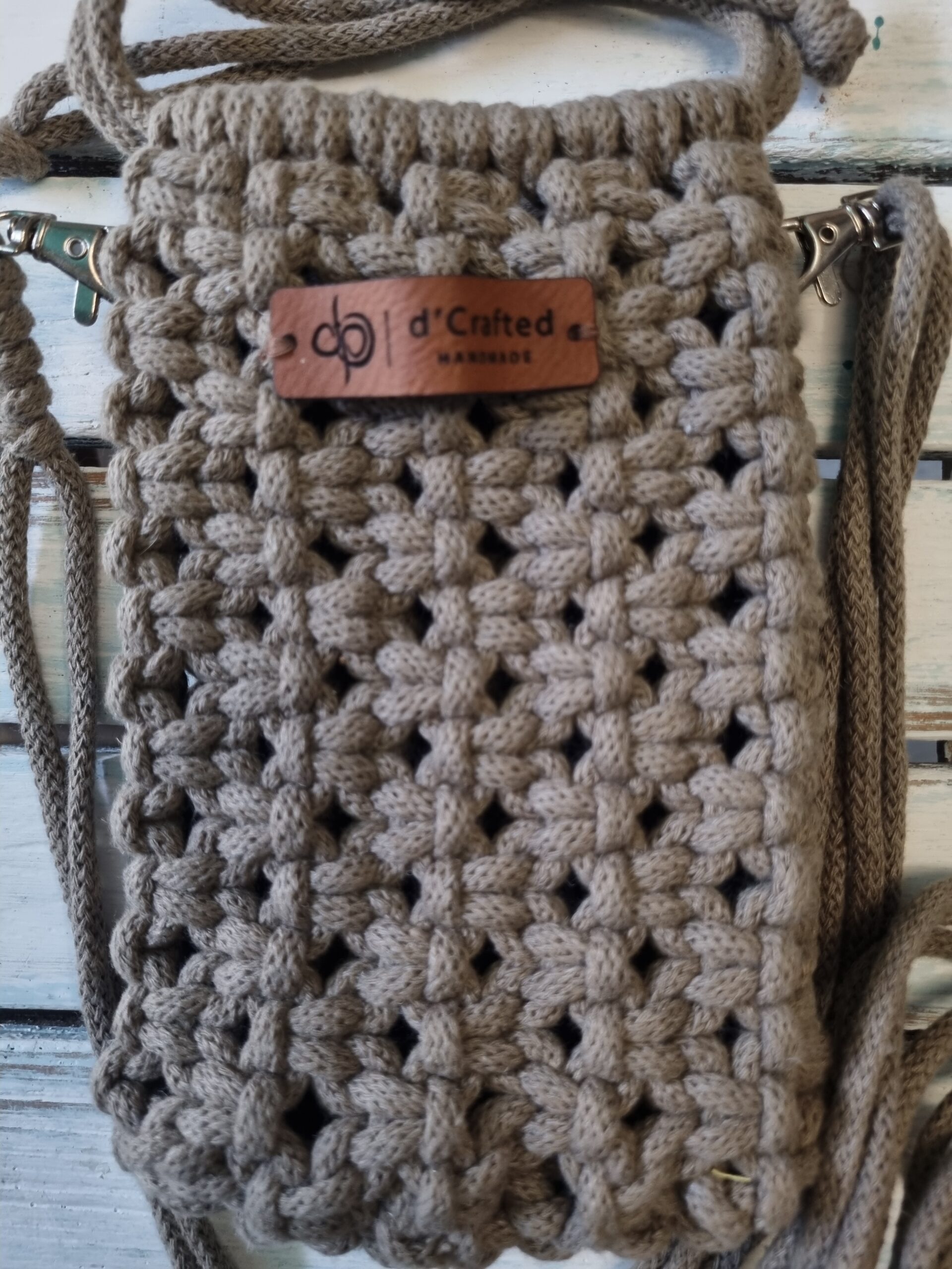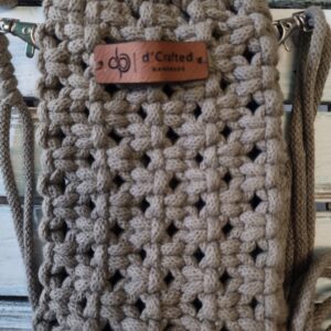 Handmade macramé Drawstring Phone Pouch with adjustable string.