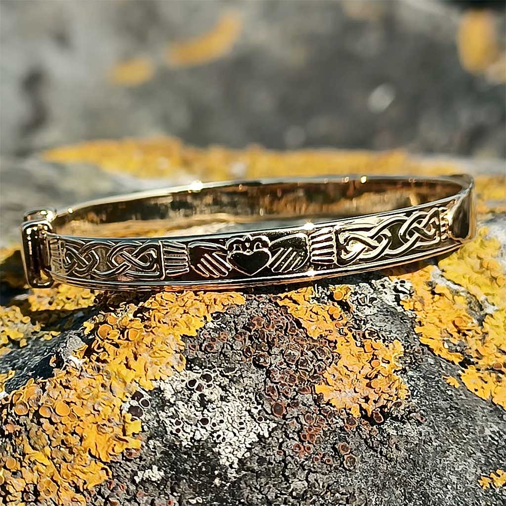 Claddagh Rings have been produced in Galway, Ireland continuously since at least 1700. The Claddagh fishing village, famed for its rings, most likely derived its name from the description of its location in Irish — probably “Cladach,” meaning stony shore. These bangles are Galway-inspired, carrying that same rich cultural heritage and making them a true Irish heirloom gift.