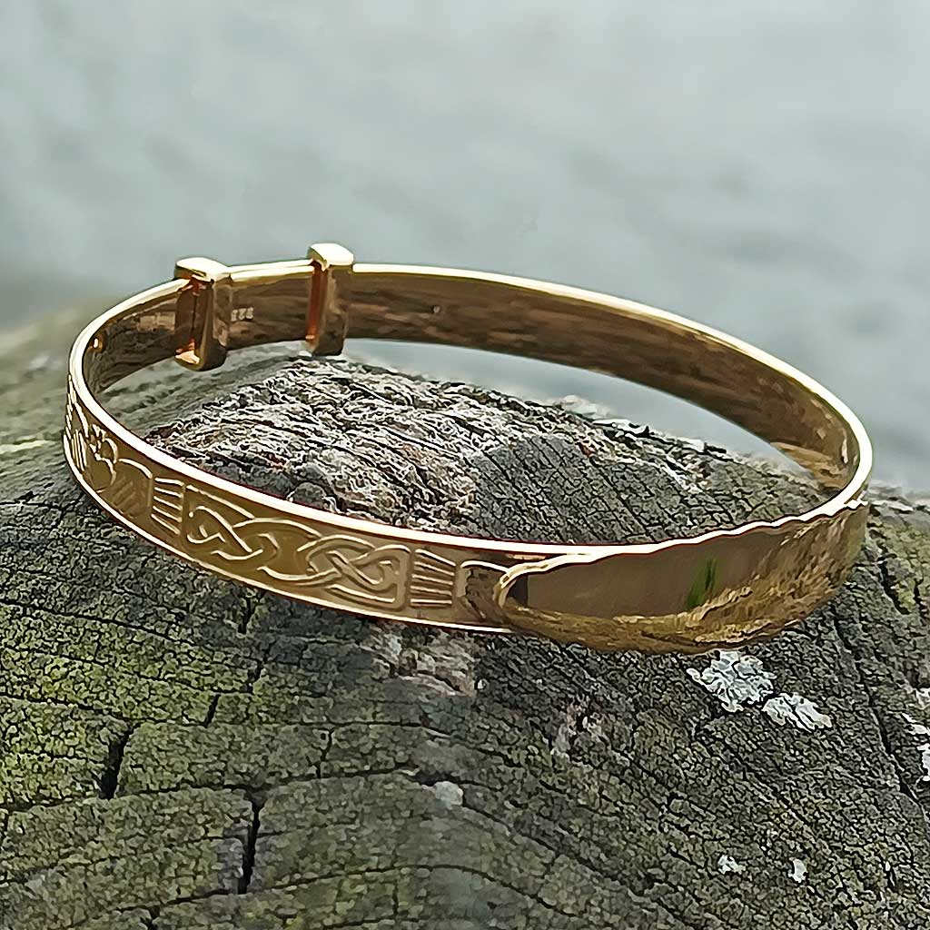 A beautifully crafted gold-plated sterling silver Claddagh baby bangle, hallmarked at the Dublin Castle Assay Office as a guarantee of quality. The expander bracelet features an engraving plate that can be personalised with a short name and/or date in a script font, surrounded by the traditional Celtic Claddagh design. Free engraving makes this a perfect keepsake gift for a Christening, new baby, baby shower, or special occasion.