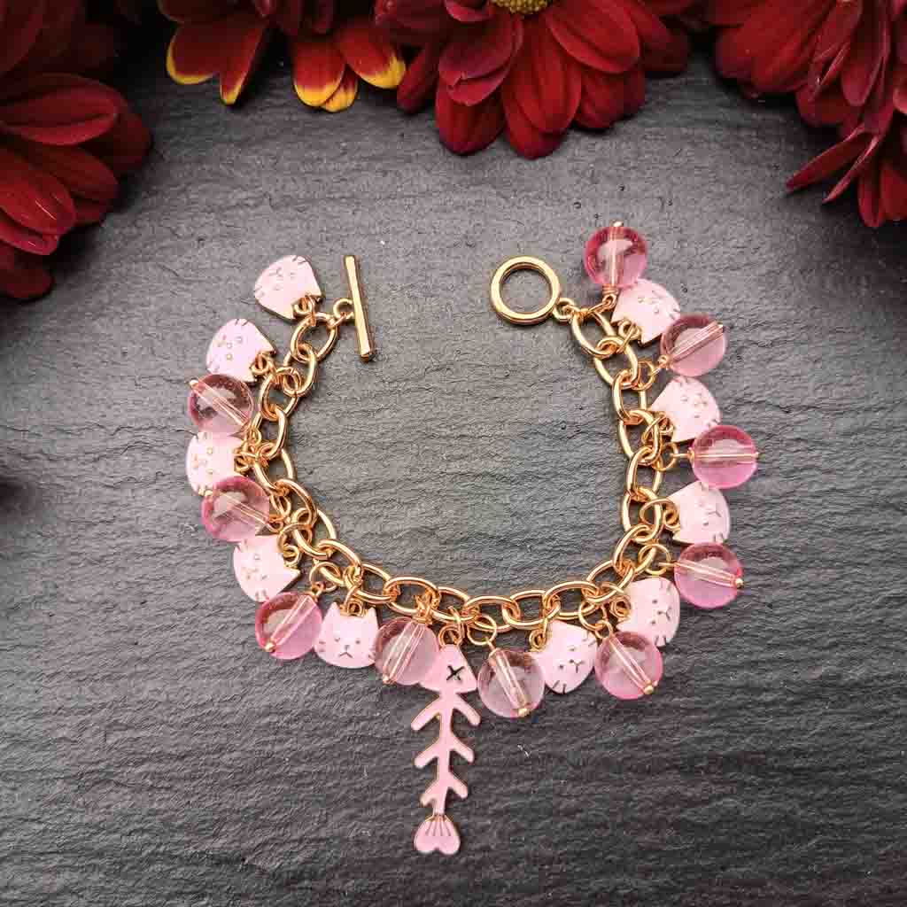 The charms are linked to a sturdy gold-tone chain with a secure toggle clasp, making it easy to put on and take off. Lightweight and comfortable, this bracelet adds a soft pop of color and personality to any outfit—great for cat lovers, kawaii accessory fans, or anyone who adores unique handmade jewelry.