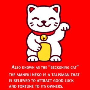 The “maneki neko” in Japanese (招 き 猫) literally means ” the beckoning cat ” or “the cat that invites”. A traditional Japanese good luck charm depicted as a cat sitting, smiling and raising one or two front paws. It is believed to bring good luck and fortune to its owner.