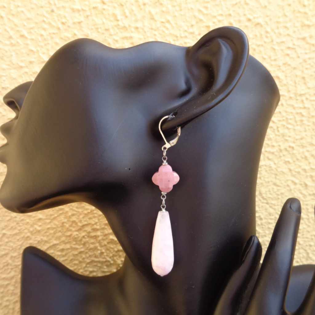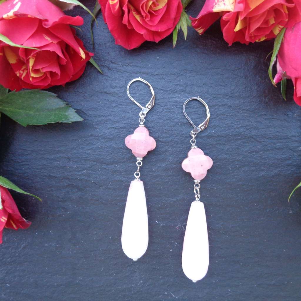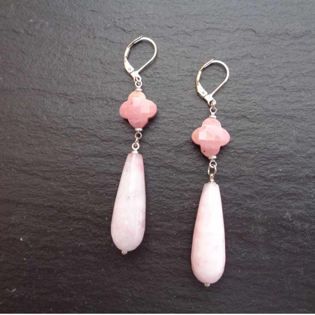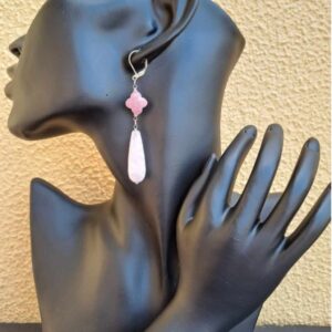 These elegant pink stone dangle earrings combine timeless design with soft, romantic color. Each earring features a faceted rhodonite Alhambra-shaped stone paired with a smooth, polished pink quartz teardrop, creating graceful movement and a beautifully balanced silhouette.